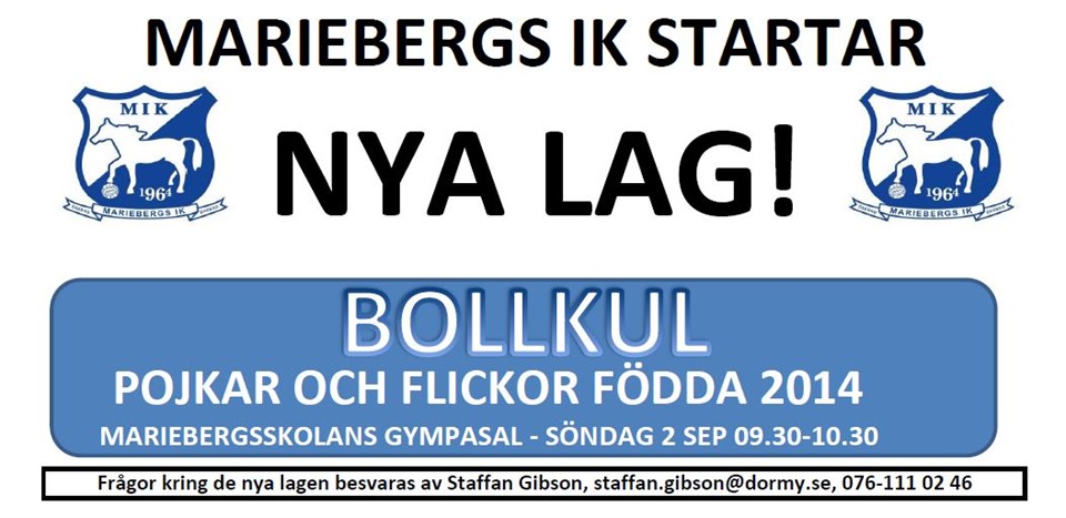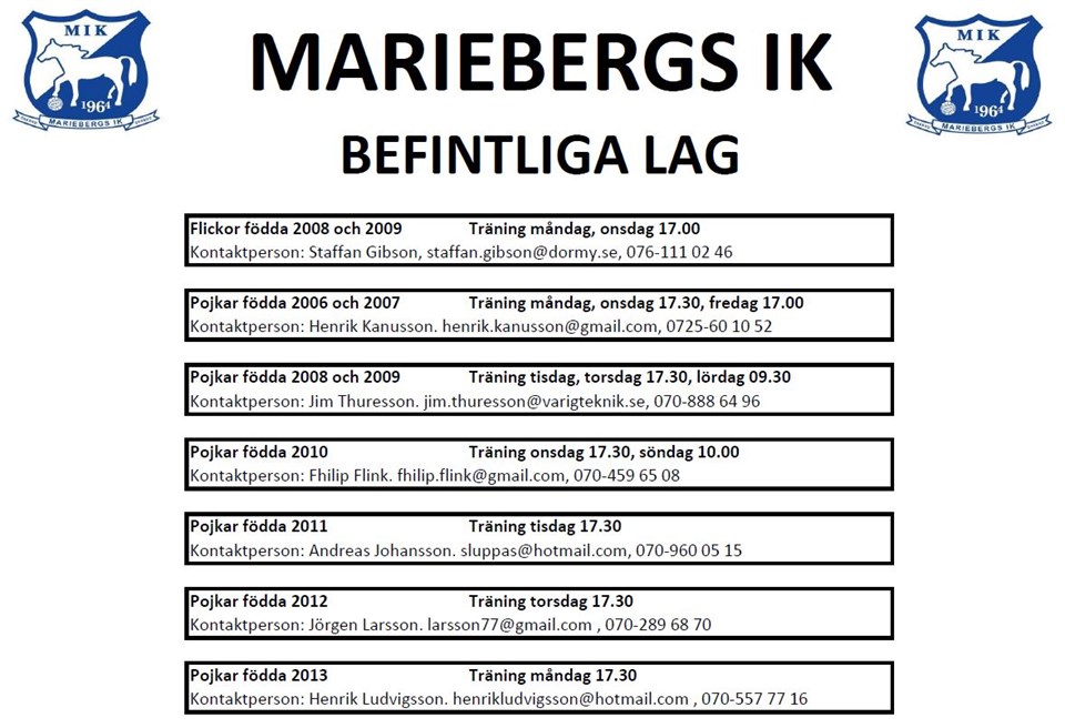 I samband med att Mariebergs IK nu startar tre nya lag, Flickor 2010+2011, Flickor 2012+2013 och BOLLKUL för barn födda 2014, kommer klubben att ha hela 11 lag i verksamhet. Alla är välkomna i Mariebergs IK, oavsett förkunskaper. Om du klickar på bilden ser du våra lag, deras träningstider och kontaktpersoner. Har du ett barn som är intresserat av att börja i något av lagen, tveka inte att kontakta oss. / Styrelsen Mariebergs IK